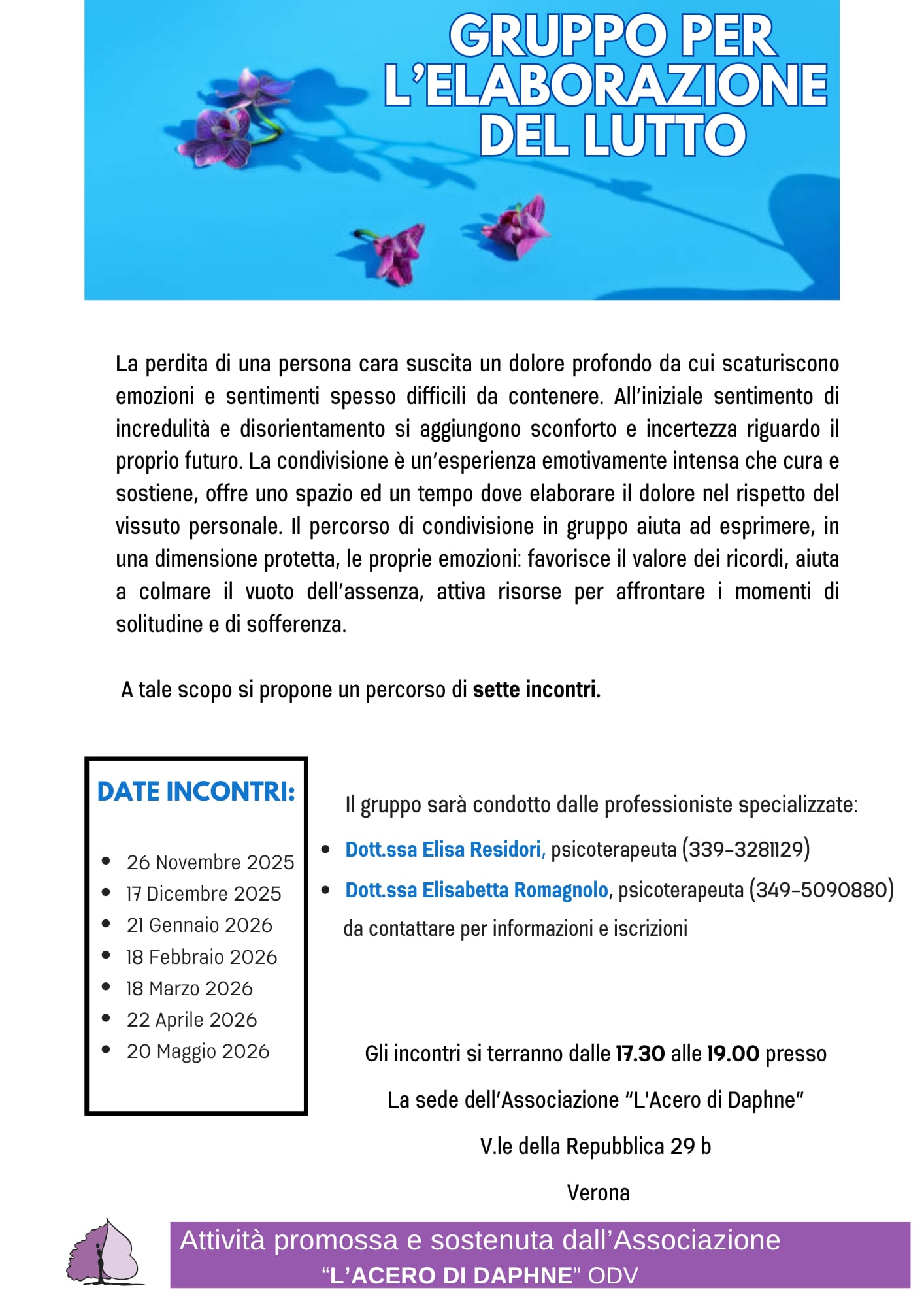 Il dolore per la perdita di una persona amata porta con sé un groviglio di sentimenti e di emozioni. Alcune di esse, come l’incredulità, lo sperdimento, la rabbia, l’impotenza permeano in modo prepotente i giorni e i mesi successivi alla morte della persona amata. Il tempo per elaborare questo dolore può essere più o meno lungo. La perdita di una persona amata cambia la vita e l’adattamento alla nuova situazione può risultare molto faticoso. Condividere in gruppo le proprie esperienze può essere di grande aiuto: permette di dare parola, senso e significato al dolore, in un contesto protetto e insieme a persone che parlano ‘la stessa lingua’.